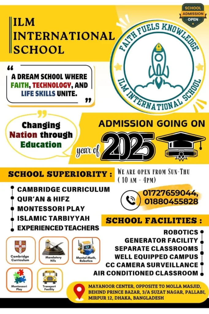 ইল্ম ইন্টারন্যাশনাল স্কুলে আমরা শুধুমাত্র পাঠদান করি না (যোগাযোগ: ০১৭২৭৬৫৯০৪৪)। আমরা হৃদয় গঠন করি, মননশীলতা তৈরি করি এবং আত্মবিশ্বাসী তরুণ মুসলিম গড়ে তুলি, যারা দুনিয়া ও আখিরাত—উভয়ের জন্য প্রস্তুত।