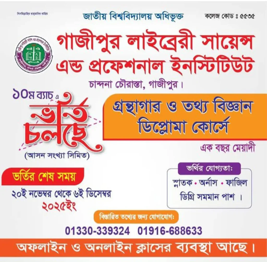 গাজীপুর লাইব্রেরি অ্যান্ড প্রফেশনাল ইনস্টিটিউটের গ্রন্থাগার ও তথ্যবিজ্ঞান ডিপ্লোমা কোর্সের ১০ম ব্যাচে ভর্তি চলছে।