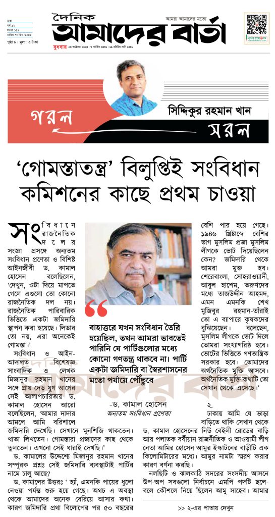 “নলছিটি ও ঝালকাঠি সদরের সংসদীয় আসনে দুই-তিনটি বাদে প্রায় সবগুলো নির্বাচনে এমপি পদটি ছলে-বলে কৌশলে নিয়েছিলেন আমু সাহেব। আমার জন্মস্থানও নলছিটি, এবং ছোটবেলা থেকে শুনে আসছি, আমু সাহেবকে পায়ে হাত দিয়ে সালাম করেন নেতা-কর্মীরা। ভক্তিসহ সালাম করা দোষের কিছু নয়, তবে আমু সাহেবের সালাম নেওয়া ছিল বাধ্যতামূলক। এই পরিস্থিতি ছিল ঠিক তেমনি, যেটা ড. কামাল হোসেন বর্ণিত ‘পায়ের ধুলা নেওয়া শুরু হয়ে গেছে’—অর্থাৎ একটি প্রথা যা সম্মানের চেয়ে শক্তি ও কর্তৃত্বের প্রতীক হয়ে দাঁড়িয়েছে। আমু সাহেব এবং তাঁর মতো নেতারা এই ‘ধুলা নেওয়ার’ সংস্কৃতির পথ প্রদর্শক হতে পারেন। পরবর্তীতে তা সংক্রামক হয়ে, রাজনৈতিক পরিবেশে পচন ধরে, ৫ আগস্টে গিয়ে কিছুটা সাময়িক বিরতি নিয়েছে। তবে এই বিরতির মধ্যে সংবিধান সংস্কার কমিশন কি নতুন উদ্যোগ নিতে পারে? এমন চিন্তা থেকেই এই লেখা। বর্তমান সংবিধান সংস্কার কমিশনের প্রধান ড. আলী রিয়াজ প্রায়শই প্রয়াত মিজানুর রহমান খানকে স্মরণ করেন। গত বছরের ১১ জানুয়ারি তিনি তাঁর ফেসবুকে লেখেন, ‘…তার লেখা বই হাতে নিয়ে পাঠ করি, নাড়াচাড়া করি। সংবিধানের বিভিন্ন অনুচ্ছেদের আলোচনা পড়ি, ভাবি মিজান এই বিষয়ে কী বলতেন।'”