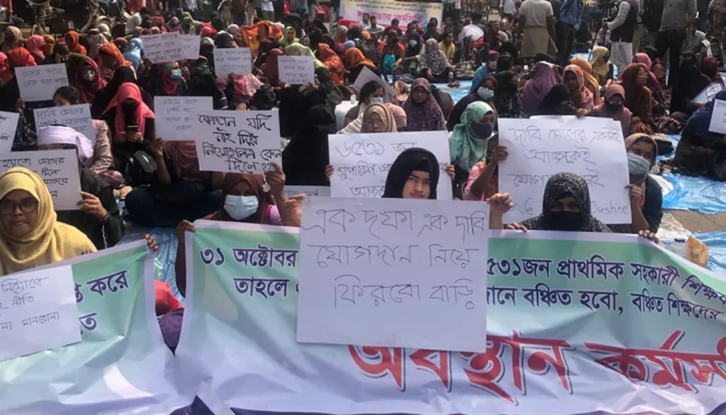 ছবির ক্যাপশন: প্রাথমিকে নিয়োগ বাতিল প্রার্থীদের অবস্থান কর্মসূচি