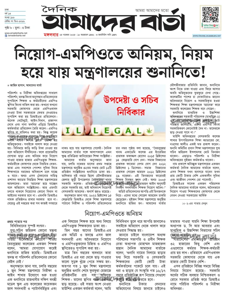 নিয়োগ ও এমপিও ব্যবস্থায় দীর্ঘদিনের অনিয়ম এখন যেন অঘোষিত এক নিয়মে পরিণত হয়েছে। ডিআইএ বছরের পর বছর পরিশ্রম করে অনিয়ম চিহ্নিত করলেও শিক্ষা মন্ত্রণালয়ের শুনানির ‘মানবিকতা’ এবং টাকার প্রভাবের সামনে তা প্রায়ই ভেস্তে যায়। ফলে অনিয়ম করে নিয়োগ পাওয়া ব্যক্তিরা যেমন দণ্ডমুক্তি পান, তেমনি সরকারি কোষাগার থেকে কোটি কোটি টাকা গচ্ছা যায়। এই ‘ধরা-ছাড়া’র সংস্কৃতি অব্যাহত থাকলে শিক্ষা খাতের শৃঙ্খলা, ন্যায্যতা এবং সরকারি অর্থের সঠিক ব্যবহার—সবই মারাত্মক ঝুঁকিতে পড়বে। এখন প্রয়োজন কঠোর রাজনৈতিক সদিচ্ছা, স্বচ্ছ প্রক্রিয়া এবং জবাবদিহির কড়া প্রয়োগ—যাতে শিক্ষা ব্যবস্থায় ন্যায্যতা ও সুশাসন পুনঃপ্রতিষ্ঠিত হয়।