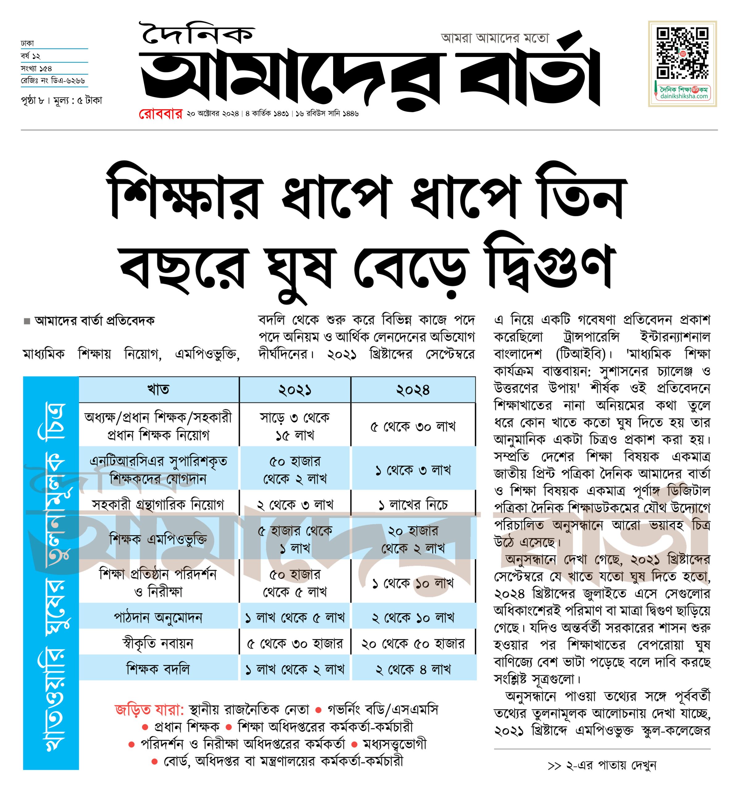 সম্প্রতি, দেশের শিক্ষা বিষয়ক একমাত্র জাতীয় প্রিন্ট পত্রিকা দৈনিক আমাদের বার্তা এবং শিক্ষা বিষয়ক একমাত্র পূর্ণাঙ্গ ডিজিটাল পত্রিকা দৈনিক শিক্ষাডটকম এর যৌথ উদ্যোগে পরিচালিত একটি অনুসন্ধানে আরো ভয়াবহ চিত্র উঠে এসেছে। এই অনুসন্ধানে প্রকাশ পেয়েছে, শিক্ষাখাতে অনিয়ম এবং দুর্নীতি এর চেয়ে অনেক গভীর ও বিস্তৃত, যা দেশের শিক্ষাব্যবস্থাকে আরো সংকটে ফেলেছে।