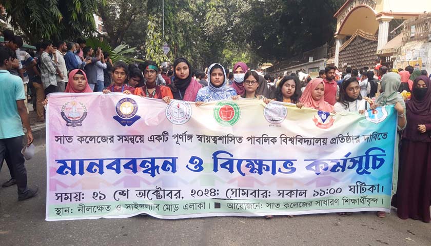 সাত কলেজের শিক্ষার্থীরা ঢাকা বিশ্ববিদ্যালয়ের অধীন থেকে বেরিয়ে একটি স্বতন্ত্র বিশ্ববিদ্যালয় প্রতিষ্ঠার দাবিতে সাইন্সল্যাব মোড়ে অবস্থান নিয়েছেন।