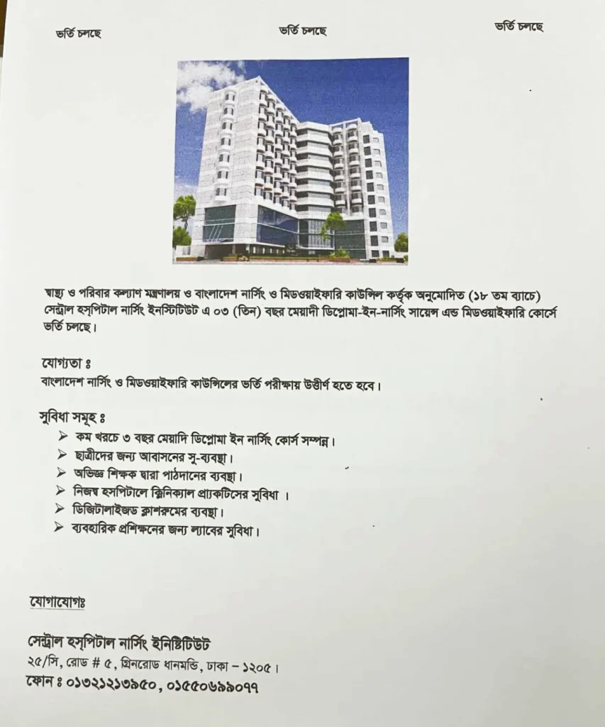 নার্সিং পেশায় আগ্রহী শিক্ষার্থীদের জন্য এটি একটি চমৎকার সুযোগ। সেন্ট্রাল হসপিটাল নার্সিং ইনস্টিটিউট দক্ষতা, মানবসেবা ও পেশাগত উৎকর্ষ অর্জনের পথপ্রদর্শক হিসেবে কাজ করছে। সরকারি অনুমোদিত এই প্রতিষ্ঠানে ভর্তি হয়ে আপনি গড়ে তুলতে পারেন একটি গৌরবময় ক্যারিয়ার। নির্ধারিত সময়ের মধ্যে আবেদন করে স্বাস্থ্যসেবার অগ্রভাগে যুক্ত হোন।